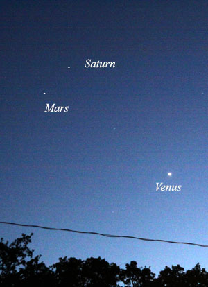 This series of photos show the movement and closest approach of Jupiter, Mars and Venus during the summer of 1991. In the top photo the planets are to the left just clearing the tree. In the middle photo, they are centered in the photo and the crescent moon has entered the show. The closest grouping occurred on 16 Jun 1991. The moon is to the left behind some clouds. These were taken with my Nikon camera and 100mm lens. The Nikon was riding on my Barn Door astro tracker. That's why the fore ground objects trailed Click here or on the picture for a larger one of the 1991 Conjunctions. You can see a star chart showing the alignment info also.