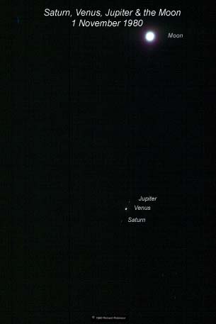 This is a picture of a close alignment of Venus, Jupiter, Saturn and the Moon in November 1980. Click here or the picture to see more pictures. The picture is a 45 second unguided exposure taken with my Nikon Camera and a 28 mm lens. |