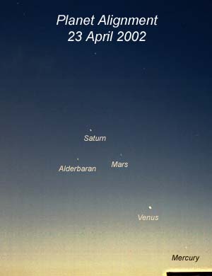 This picture is of a close alignment in April 2002. You can see Mercury, Venus, Mars, Saturn and the bright star Alderbaran. Click here or the picture for a larger picture that also shows Orion's belt. The picture is a 60 second unguided exposure taken with my Nikon Camera and a 28 mm lens. |