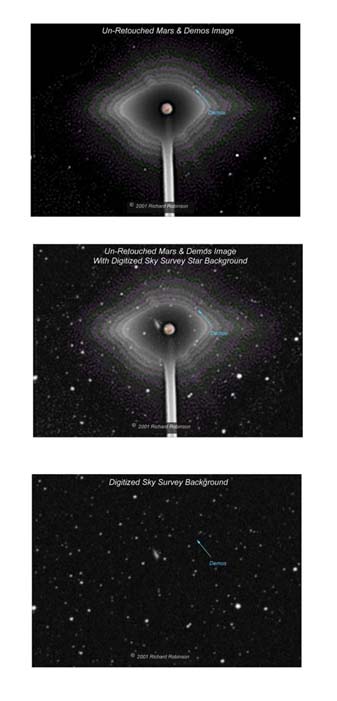 | The bottom image is just the background star image from the Digitized Sky Survey Catalog. I've left the blue arrow which was pointing at Demos in my image. The arrow is pointing at a blank space, so what ever is showing in my image, it is not a background star. Since it 's in the correct position for Demos, I'm taking credit for Demos | |