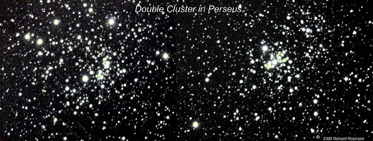 | The double cluster is a very nice object in binoculars. Many people wonder why it was not included in the Messier Object list. It is bright, well placed for northern observation and more stunning that other objects that were included. The left most cluster in NGC 884 and the right most cluster in NGC 869. This image is two separate exposures taken with the MX-5C and STAR 2000 auto tracker. At f3.3, the MX-5C just captures both clusters in two exposures. The field of view of this image is about 21 x 54 arc min. The image captures stars dimmer than magnitude 15. At a diameter of 29 arcmin, each cluster is about the same size as the full moon. | |