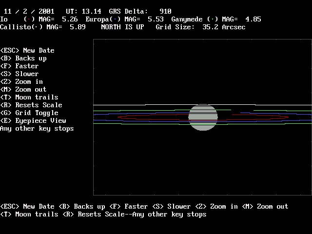This shows how the simulator screen looks while it is running. The moon "Trails" feature was turned on for this screen capture and you can see the break in the trails as the moons entered in and out of Jupiter's shadow. This shows how the program simulates the moons disappearance and re appearance from being eclipsed. Many commercial programs do not simulate this feature. You can also see the menu options. You just press a key while the program is running. |