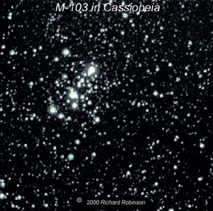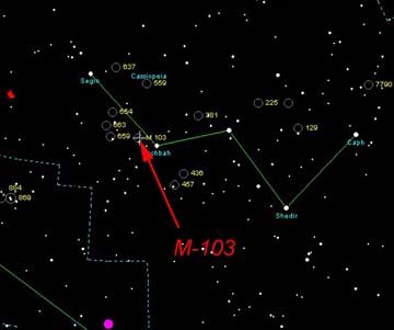 | M-103 is a small tightly grouped open cluster in located in an area of the sky that is very rich in stars. It is bright enough to be seen with binoculars and should be easy to find because of it is located only about one degree from the magnitude 2.7 star, Ruchbah, in the "W" shaped constellation of Cassiopeia. | |