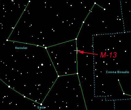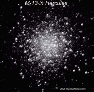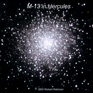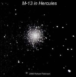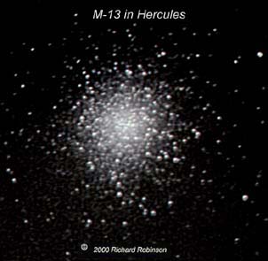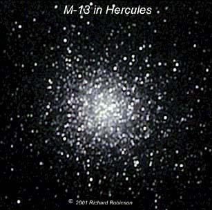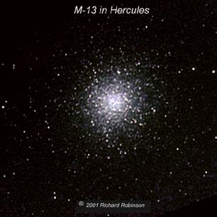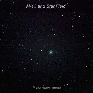 | M-13 is know as the "Great Globular Cluster" in Hercules. It is very large and bright and a superb sight even in a small 90 mm scope. In an 8 or 10 inch scope the cluster seems to be a swarm of stars that is sure to impress any first time observer through your scope. It is also easy to find because of it's location in the constellation. M-13 is a very nice object. I have imaged it several times trying different focal ratios and exposure combinations. I've found that it is very difficult to capture the visual appearance of the Globular with a CCD images. The visual appearance to me is that of a swarm of stars. The f4.8 image is my best approximation so far. | |