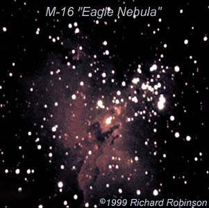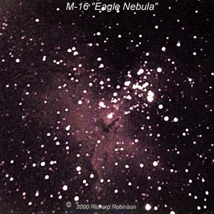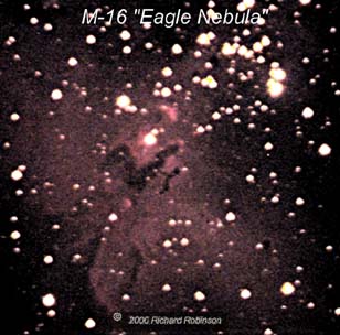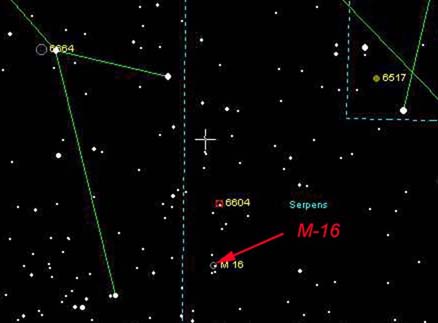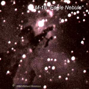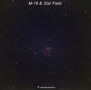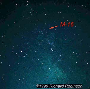 | M-16 is several degrees above M-8. The stars around M-16 are easy objects for amateur scopes and the nebula begins to appear even with short CCD exposures. However, seeing the nebula itself may be a challengs unless you have dark skies. Binoculars may show a fuzzy patch of light, at the location shown in the image below taken with the Nikon Camera. Be sure to look at the HST image. It shows terrific detail of the end eagles beak. | |