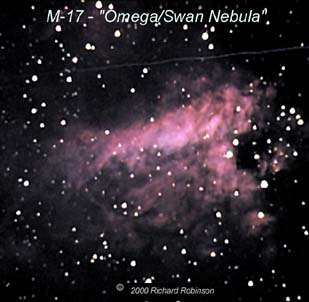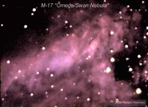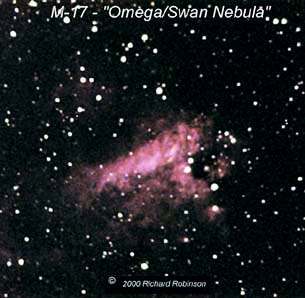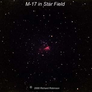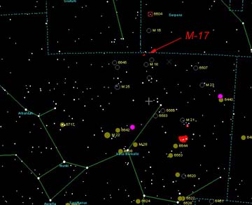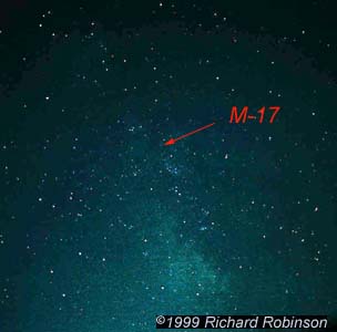 | M-17 is several degrees above M-8. The stars around M-17 are easy objects for amateur scopes and the nebula begins to appear even with short CCD exposures. However, seeing the nebula itself may be a challenges unless you have dark skies. Binoculars may show a fuzzy patch of light, at the location shown in the image below taken with the Nikon Camera. | |
