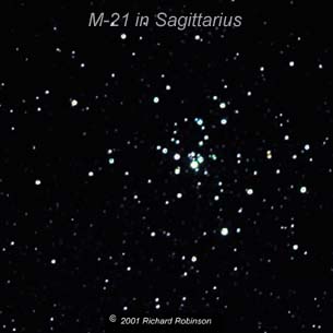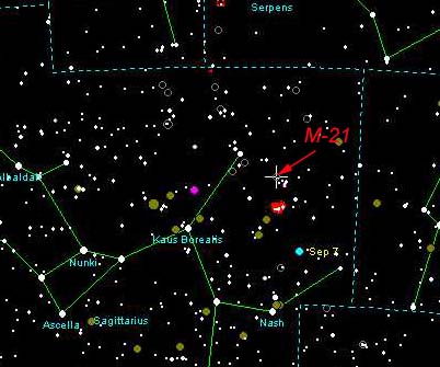 | M-21 is small but much brighter than M-24. It is also in the star rich portion of the sky near the Milky Way. You may be able to spot it with binoculars, if you have a clear view of the constellation Sagittarius and a dark sky. The appearance in a small scope will be an "arrowhead" shaped grouping os stars. | |