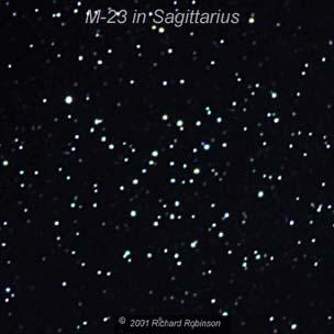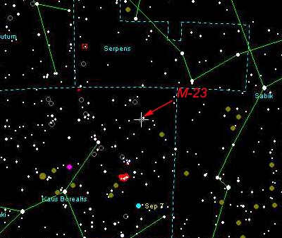 | M-23 is a large and brighter than M-24. It is also in the star rich portion of the sky near the Milky Way. You may be able to spot it with binoculars, if you have a clear view of the constellation Sagittarius and a dark sky. | |
