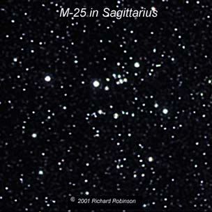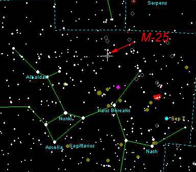 | M-25 is much larger and brighter than M-24. It is also in the star rich portion of the sky near the Milky Way. You should be able to spot it with binoculars and maybe with the unaided eye, if you have a clear view of the constellation Sagittarius and a dark sky. | |
