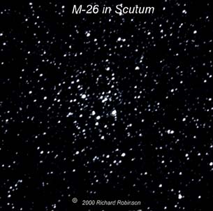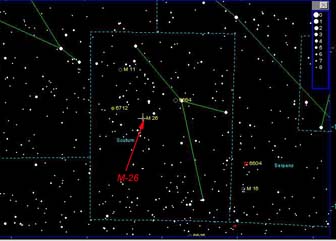 | M-26 is another large open cluster in a star rich portion of the sky. It covers about the same area of the sky as 1/2 the size of a full moon. You can find it because it is close to the bright stars in the constellation Scutum. However, the number of stars is much smaller than other open clustrs. | |