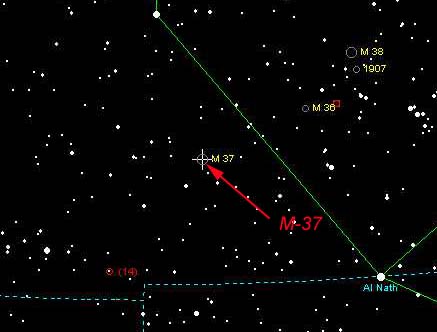 | M-37 is a small open cluster about 15 degrees below the bright star Capella. M-36, M-37 and M-38 are all in the same general area of the sky. You should be able to see them in binoculars if you can find Capella. | |