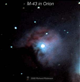| M-43 is located adjacent to the Great Nebula M-42. It often appears in the same image frame as M-42, but it was assigned a separate number by Charles Messier. | |