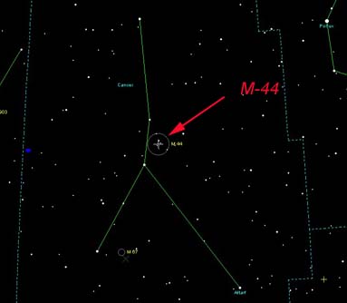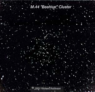 | M-44 is nicknamed the "Beehive" Cluster because it seems to be a swarm of stars in a wide field of view eyepiece. Even binoculars will clearly show it. It's full extent is about 1-1/2 degrees or three times the size of a full moon. | |