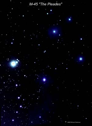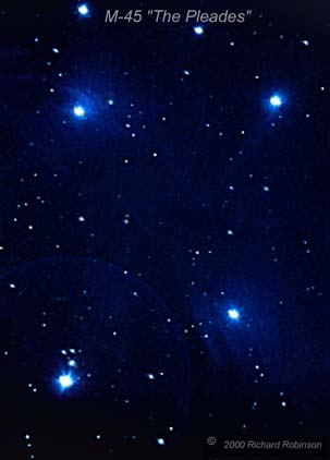 | M-45 is also known as the seven sisters. It is a very large object covering almost two degrees of the sky. My image only captured five of the seven stars comprising the seven sisters. The two missing stars are to the left of the brightest star in the image. My exposure is just beginnig to show some of the nebulosity surrounding the stars. The next time I try to image M-45 I'll use my Nikon 35 mm film back to capture the entire cluster with one exposure. | |