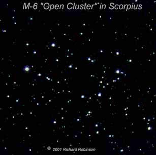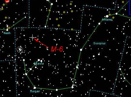 | M-6 is another large open cluster in a star rich portion of the sky. It covers about the same area of the sky as 1/2 the size of a full moon. You can find it above the stinger in the tail of the Scorpius. It will be difficult to see if you live far north. | |