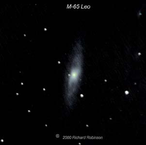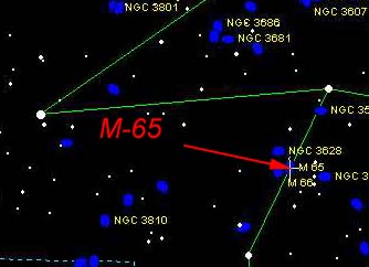 | M-65 is a reasonably bright galaxy and is visible in an 8 inch scope. Maybe six inch if you have dark skies. If you locate it, be sure to view M-66 and NGC 3628. A wide field eyepiece may allow you to view all three galaxies at the same time. This galaxy grouping is known as the Leo Trio. | |