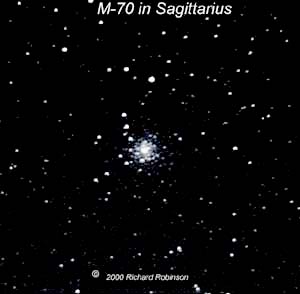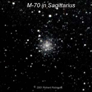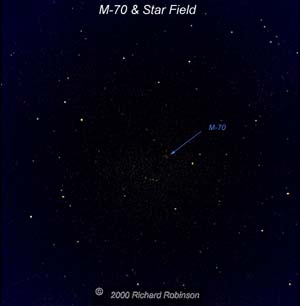 | M-70 is a small and compact Globular less than 1/2 the size of M-13. It is also about two magnitudes dimmer and it's -32 degrees declination causes it to be somewhat of a "horizon hugger" for observers in the northern latitudes. From my location near WASH DC, USA, it seldom appears more than 20 degrees above the horizon and is almost always firmly enveloped by light pollution. | |