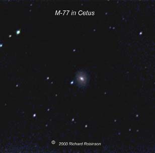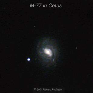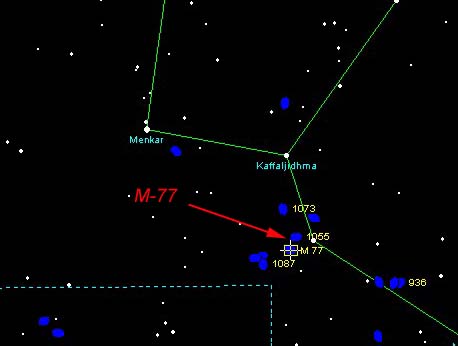 You should be able to glimpse it as a fuzzy star in a 90 mm scope because of the concentrated bright central core area. The stars of the constellation Cetus are relative dim. If you can see them from your location, then you have a chance of finding M-77 without a computer guided scope. Use the magnitude 4.1 star, Delta Cet as a starting point. M 77 is about 1 deg from this star. NGC 1055 is about two magnitudes dimmer than M-77. At magnitude 11.4, it probably wont be visible in a 90 mm scope. |