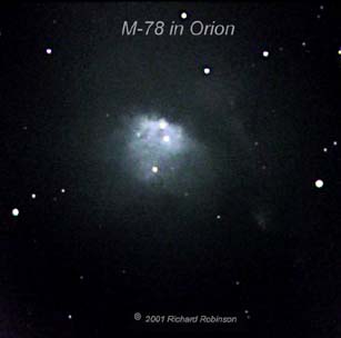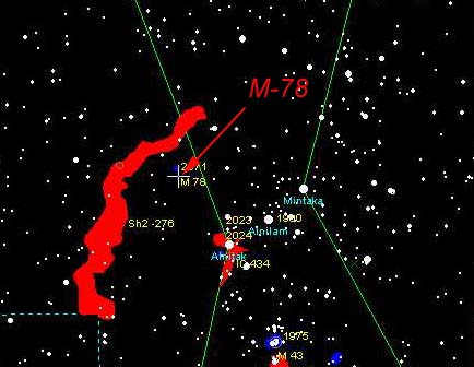| M-78 is located in the Orion Group of nebula and is one of the brightest diffuse reflection nebula in the sky. You may be able to see in in a small 90 mm scope from at dark sky location | |