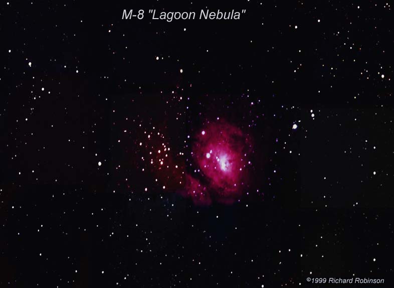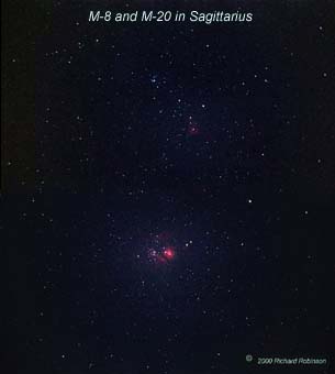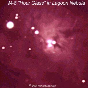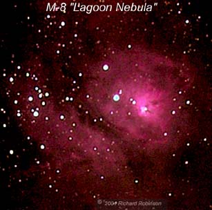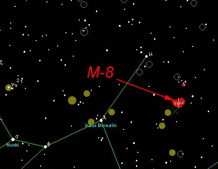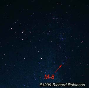 | The stars surrounding M-8 are easy objects for amateur scopes. Even binoculars will show a fuzzy patch of light, similar to the image below taken with the Nikon Camera. | |