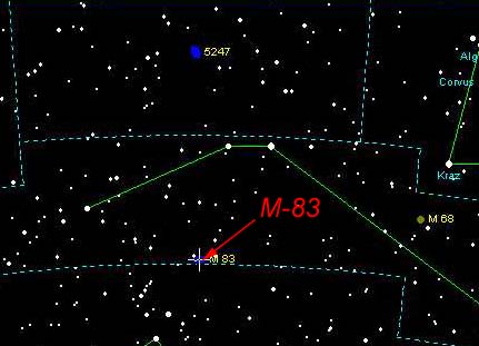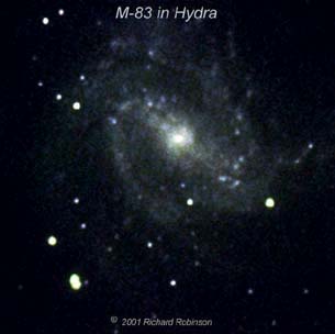 | M-83 is a nice spiral galaxy in Hydra. It should be visible in a 6-8 inch telescope, if you can see southern objects. However, it will take a much larger scope to see more than the central core, because the arms have a low surface brightness. I needed a 60 minute exposure to image them with my 8" LX 200. | |