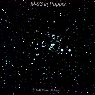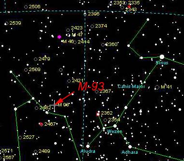 | M-93 is large open clusters in the constellation Puppis. The best way to find them is to locate the bright star Sirus. If you can see Sirus, you will be able to locate M-93 binoculars. M-47 and M-48 are also open clusters visible in binoculars. They are almost directly above M-93. | |