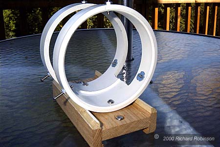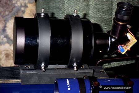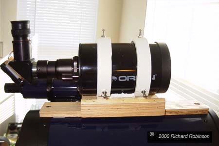 The next problem was how to mount the MAK to the LX 200. I tried a piggyback camera mount and pan head, but there was just too much flexure. Next I looked at the Losmandy dovetail plates and finder rings. This was exactly what I needed, but I kept choking on the $300 price. So I decided to try to build a Richard's version which would be a little more in my price range. This is what I came up with for about $12. It works pretty good, but keeping the MAK aligned with the main scope is not easy. At 40 power, a very small shift or flexure in the mount causes the image to miss the CCD. What I usually need to do is re-center the MAK at the beginning of each session and then check on the cross hairs position as I move from one object to the next. If I'm careful, the MAK will put the object on the CCD even at f30. I don't know if the Losmandy rings would have this problem, but mine works OK for me. |