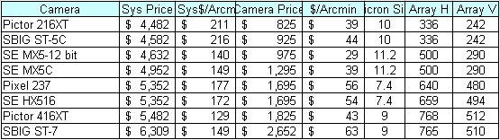 The system price includes the LX 200, JMI Motofocus, the focal reducer and equatorial wedge. It also included any camera specific add-ons I would need to buy. For example the Pictor models uses the serial port for the camera to computer interface. To also interface the laptop to the LX 200, I needed to purchase a PCMCIA adapter to add a second serial port. The dollar per arcmin figures are based upon a f10 LX 200 with the f3.3 focal reducer. Arcmin calculations were based upon the diagonal of the CCD chip size. The Pictor 416XT is a good performer from both the Sys$ per arcmin and camera $/ per arcmin values. It did exceed my $5,000 target for the total system price, but not by too much. The two MX-5 Starlight Xpress cameras met my system price target and performed very well in both system $/arcmin and camera $/arcmin criteria. Leading me to conclude very good value for the dollar.