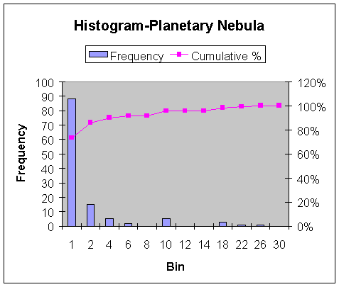 Chart #2 through #4 are histograms of the angular size of these objects. The "Bin" is the angular size in arc-minutes. The vertical bars are a count of the number of objects in that bin. For example, in Chart #2, 1,536 of the NSO objects counted have a angular size between 2 and 4 arc-min. And about 80% have a size less than or equal to 4 arc-min. 98% have a size less than or equal to 12 arc-min. At f3.3 the MX-5C has a diagonal field of view of about 33 arc-min. So it can easily image over 98% of the NSO brighter than magnitude 14. At f10, the MX-5C has a diagonal field of view of about 11 arc-min. Charts #3 and #4 show histograms for the size of planetary nebula and Globular clusters. These show that the MX-5C can image all planetary nebula and about 97% of the Globular clusters on LX 200 operating at f3.3. All in all I felt that this was pretty good performance. For those few objects I could not image in a single frame, I could always mosaic the images or put my Nikon film back on the camera. |