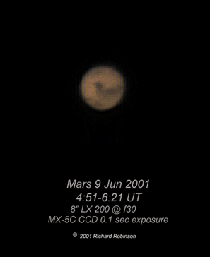 The animation consists of about 20 individual frames taken with my MX-5C CCD and 8" LX 200 working at a focal to diameter ratio of f30. The time period between frames varies, but is usually between 3 and 5 minutes. For each frame I took a series of 10 individual images and then went back through each series and selected the best to include in the movie. |