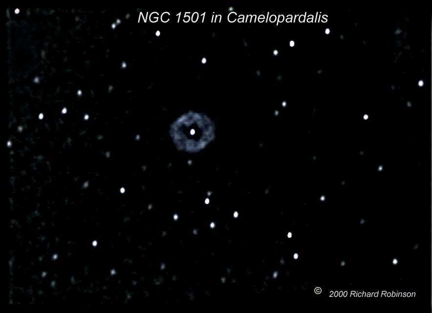 This image was taken at the prime focus of my 8" f10 LX 200. This is a 35 minute exposure generated using the MX-5C and the STAR 2000 auto-tracker. One 5 minute and three 10 minute exposures were combined in MaxIm DL and further processed in Photoshop. All color conversion was accomplished in the STAR 2000 software. At magnitude 13.3, it is very dim and difficult to image. It is slightly larger than the planet Jupiter appears to be. Click here to go back. |