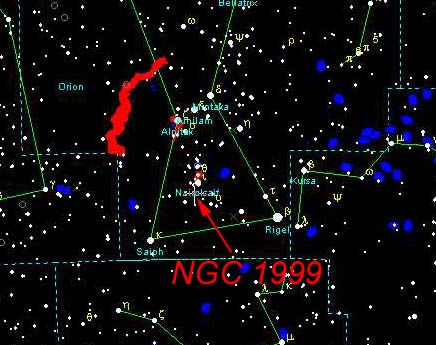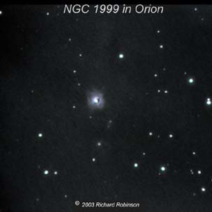 | NGC 1999 is another large reflection nebula in Orion located just below the Great Nebula, M-42. The nebula itself is very difficult to see and just barely becomes visible in my images. The NOAO image is one of the best ground based images available and the HST image captures the detail around the bright star, which is about magnitude 10. You wont be able to see the dim outer regions shown in the NOAO image visually, but you should be able to see the bright star and the triangular dark patch visible in my images. For the dark patch, use 300-400 power and at least eight inch scope, larger if available. | |