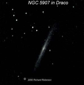 NGC 5907 is a very nice edge on galaxy. For observers in the northern hemisphere it is very well placed for imagining. The image shown here was taken on a very hazy night when I could not see the stars in the constellation Lyra, except for Vega. This image shows what can be done with modern equipment even under poor viewing conditions. I hope to get an image under better conditions. |