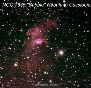 | NGC 7635 is a large object with low surface brightness. It should be difficult to see in amateur scopes. I don't know for certain, because I did not try to see it visually when I took these images. All together four 20 minute guided exposures were needed to clearly show the bubble and display good color saturation. | |