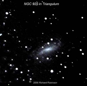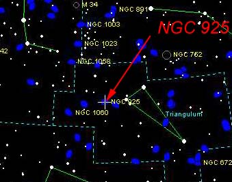 NGC 925 is visible in an 8" scope, but to see it well you'll need a much larger scope. The drawings shown in the Dec 99 Sky & Telescope article were made using a 20 inch scope. NGC 925 is one of the galaxies being observed under the HST Key Project on the Extragalactic Distance Scale. This project will help determine the value of the Hubble Constant. |