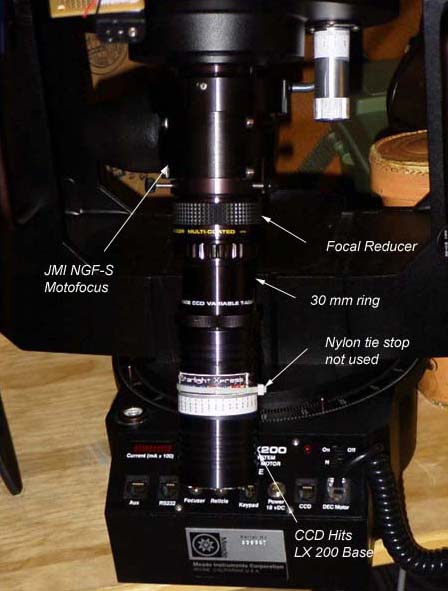 The Meade f3.3 focal adapter is attached to the JMI Motofocus using an adapter purchased from ADIRONDACK VIDEO ASTRONOMY. This adapter slides into the JMI 2" eyepiece position and then duplicates the threads on the back of the SCT. This allows using any SCT accessory with the JMI. The 30 mm ring is installed to result in a f3.3 optical configuration. An additional adapter (also ordered from ADIRONDACK) is required to be installed between the 30 mm ring and the MX-5C because the pitch of the threads in the 30 mm ring is 0.75 threads per mm while the pitch of the threads on the inside of the MX-5C barrel 1.0 threads per mm. Finally the MX-5C is attached to this final adapter. Note that in this configuration, the CCD will hit the LX 200 base and that the nylon tie serves no purpose in this configuration. |