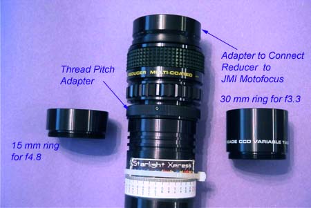The JMI Motofocus adapter and the thread pitch adapter were purchased from ADIRONDACK VIDEO ASTRONOMY. The 15 mm extension ring and 30 mm extension ring were included with the Meade focal reducer. The photo shows the connection without any extension rings. This configuration results in a focal-diameter ration of about f6.6. |