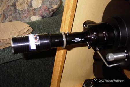 The JMI Motofocus will accept 2 inch diameter eyepieces, so the MX-5C will slide in with out any additional adapters. I have placed a nylon tie around the MX-5C to act as a stop. This insures that I always position the MX-5C at the same position. I've also taped a paper scale to help orient the camera with the right ascension/declination axis. |