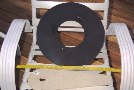 The guide is made from a piece of the same 1/8" material that the tray is made from. The router is mounted with the cutting blade passing through the 1-1/2 " hole. You then attach the guide to your work piece with a small wood screw at the appropriate radius. To cut the circle, just start the router and move it carefully in a circle. Clamp your work piece onto a steady table over a piece of scrap so you can cut all of the way through into the scrap wood without cutting your work table. Cut the large diameter circle first. If you are not use to working with routers, ask someone who is to make the cut for you as this can be a tricky and dangerous process. |