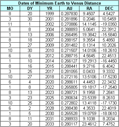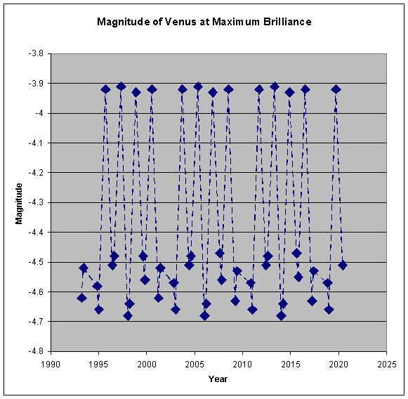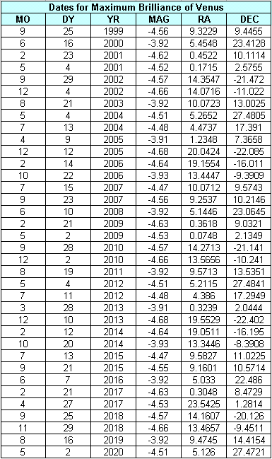 Venus over the next 20 years. Of these the Maximum Brilliance Table