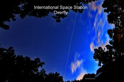 This picture captures an overfly by the International Space Station. It is made from two 30 sec exposures using a Canon EOS 7D camera with a 10mm lens. The camera was guided using the Orion Star Shoot Astro Tracker. |