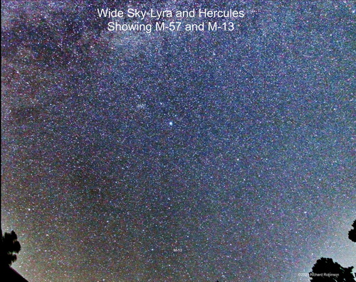 This picture captures the constellation Lyra and Hercules. It's made from six 30 second exposures using a Canon EOS 7D camera with a 10mm lens. ISO was set at 6400. I've marked the location of M-57 and M-13 on the image. The camera was guided using the Orion Star Shoot Astro Tracker. |