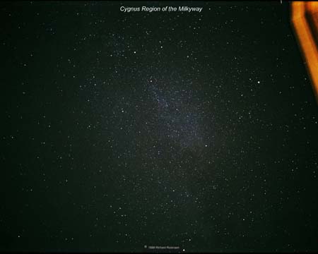 This picture is centered on the Cygnus region of the Milky Way. You can also see the constellation Lyra to the right of center. Click here or the photo to get a large picture. This was a 15 minute exposure through a 28 mm lens. |