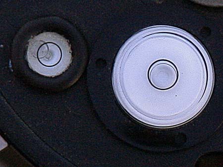 I've chosen to level using the purchased level. The bubble appears slightly off in this photo because the camera was not directly over le level. The bubble actually is properly centered. Note that the level built into the wedge shows a significantly different reading than the larger separately purchased level. As a result I highly recommend that you do not rely on this built in level to position your base. |