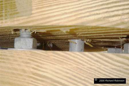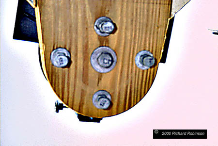 Note that the leveling bolt has two nuts and washers, one each on top and bottom of the rail arm. You can also see that the leveling bolt extends into a hole larger than the bolt itself. Inside this hole is the head of a short bolt recessed into the leveling platform and held in place with a T-nut. Thus the leveling bolt comes in contact with the head of the recessed bolt and not the wood of the rail arm. This design gives a good firm steel to steel contact for the leveling bolt. |