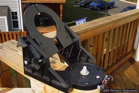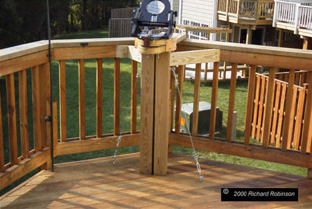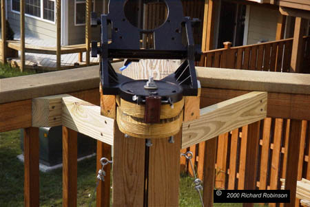 | One of the first challenges I faced with the LX 200 was getting a good polar alignment. The two-star alignment worked very good and was quick and easy. Getting a good polar alignment was another matter. I could go through the coarse alignment procedures in the Meade manual with no real problem, but the resulting alignment was not good enough for either long term tracking or using the GOTO function to locate objects. I read posts where people would say the got good polar alignments in 15-20 minutes, but not me. I always need 45-60 min to go through the drift method. So the obvious answer was to mount the equatorial wedge permanently. Get it aligned and never touch it was my basic goal. These photos show what I've ended up with. It works reasonably well. So far I've only had to adjust the alignment twice as the seasons changed and the deck shifted. Now I can go out, perform a one star alignment and be imaging in about 30 minutes after deciding to take the scope out. The scope can be set up in about 15 minutes, but it takes another 15 minutes to get the CCD stabilized, dark frame and flat fields taken. I need flat fields when imagining with the focal reducer. |