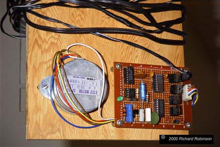 The electronics use an IC 555 as the oscillator and counting IC's to drive the stepper motor coil through the power transistors. The system runs on 12 volt DV. I've included two switches. One reverses the direction of the motor rotation and the second provides a x100 rotation rate so the platform can be quickly reset to it's starting position. |
