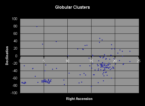 Globular cluster are a swarm of stars rotating about a common center of gravity. Some, such as M-80 are very compact and dense. Others such as M-4 are much more diffuse and spread out. A quick scan of the thumbnail images below will show how varied they can be. Many clusters are relatively bright and easy to see and image in a small amateur scope. The chart above shows distribution of Globular Clusters brighter than magnitude 14 in terms of right ascension and declination. Most of them are below the equator, so observers in the southern hemisphere are favored. Northern observers still have quite a few to observe though, and you can observe almost 1/2 of them if you can see down to declination -30. Click here for a table that list of the brighter ones. |
