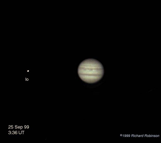| This image was taken as the moon Io was starting to move towards Jupiter after coming around from the backside. The image of Jupiter is blurred slightly by either a small focusing error or seeing effects of atmospheric turbulence. However, you can see several belts, some white ovals and some features trailing off of the north tropical belt. North is up in this image. Click here to go back. |